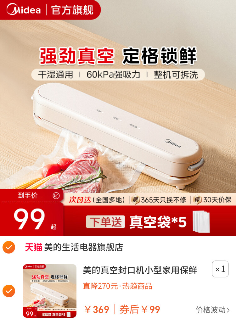 美的真空封口机 小型家用保鲜抽真空 全自动食品包装机 密封机 迷你塑封机