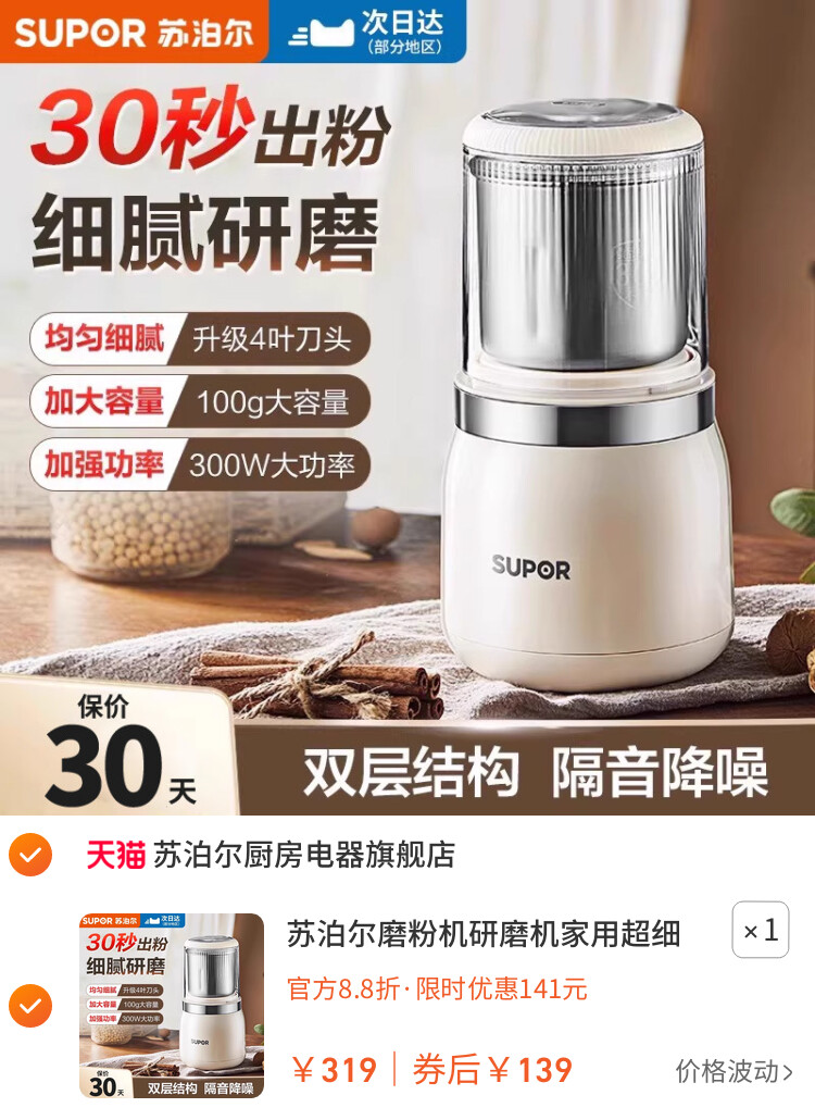 苏泊尔磨粉机研磨机家用超细打粉机小型多功能干磨五谷杂粮粉碎机