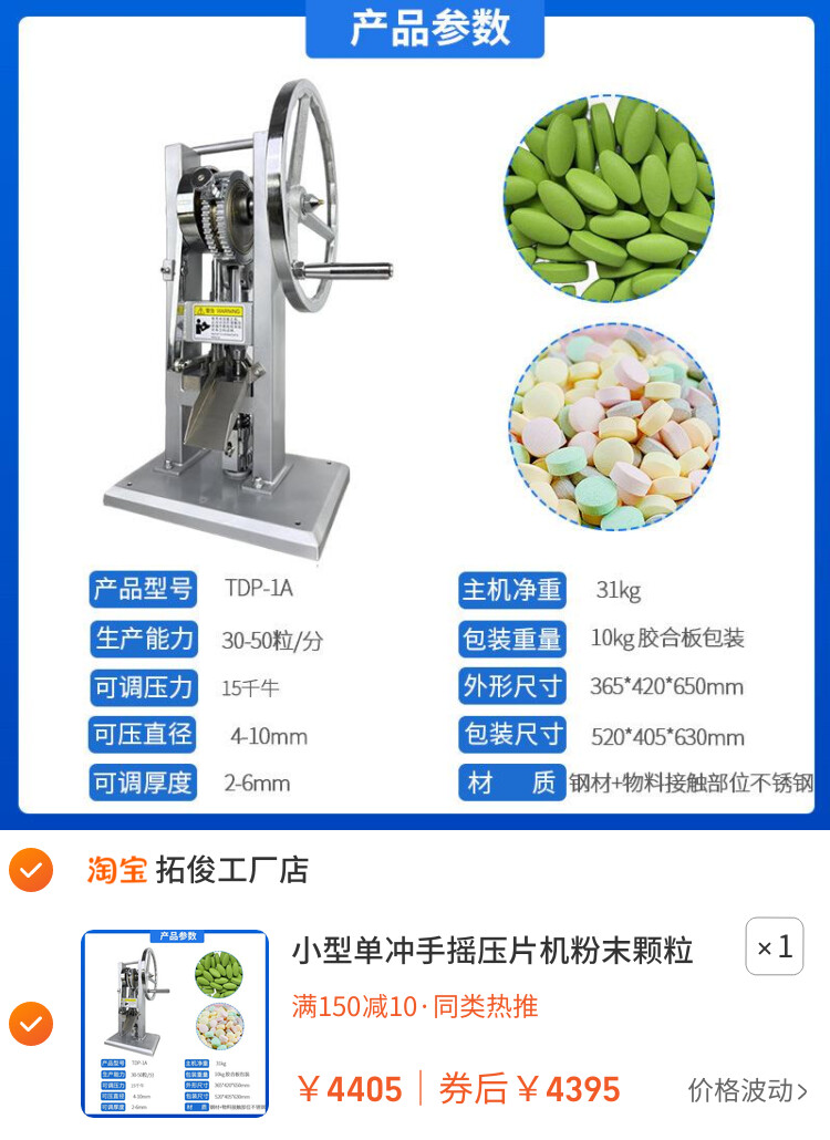 TDP系列粉末颗粒大手轮食品单冲压片机12MM维生素片糖果制片机